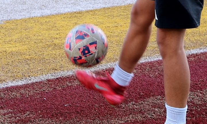 A Tolleson High School student, coached by Mr. C, juggles a soccer ball at practice.