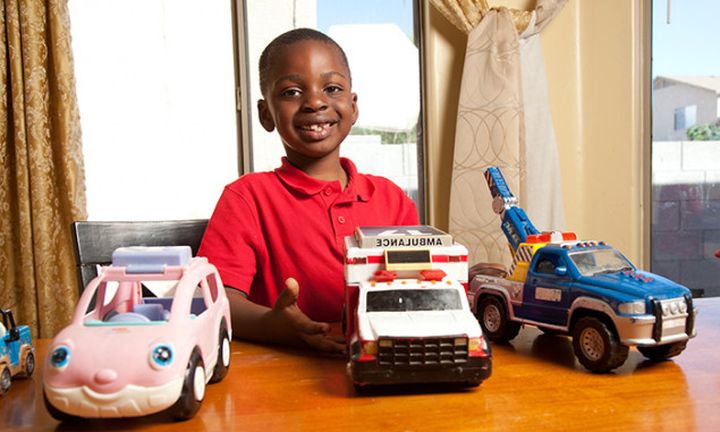 Kindergartner Muhoza enjoys math and science, especially looking at dinosaur bones.